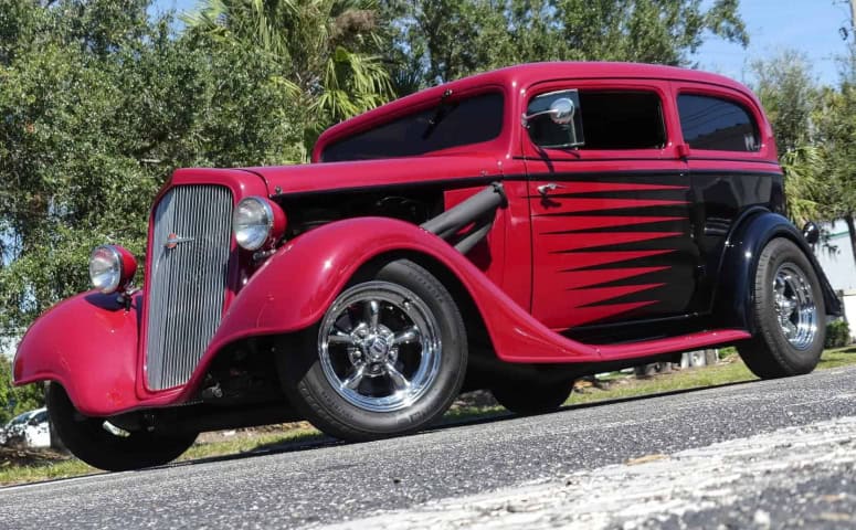 If you're looking to stand out, look no further. This custom street rod will grab attention for all the right reasons. The two-tone custom paint job features Boston Red Metallic paired with Orca Black Metallic in a classic hot rod scallop design really fit this body well. This is a real steel body that has been chopped 3.5” and given suicide doors!