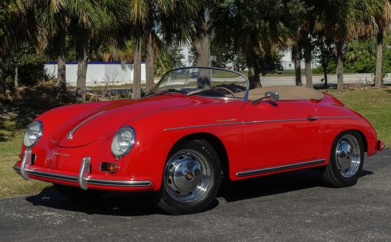 This 356A replica is finished in bright red paint over saddle vinyl upholstery and is powered by a 1,835 CC flat-four paired with a four-speed manual transaxle. Equipment includes a brown soft top, 15″ wheels, body-color bumpers, a Sony stereo, a Moto-Lita wood-rimmed steering wheel, and tonneau cover, The car features gold badging, a vented decklid, and dual exhaust outlets with polished finishers, a tonneau cover and side curtains. There is a bit of discoloration visible on the right-side curtain window. Chrome-finished 15″ wheels wear Porsche-branded hubcaps and are mounted with Firestone F-560 tires. The cabin features low-back front bucket seats and a rear bench upholstered in brown vinyl with color-coordinated door cards and tan carpets.