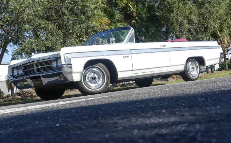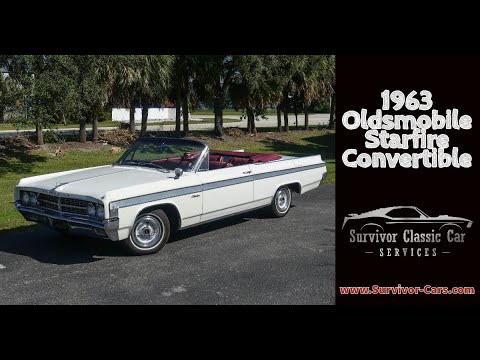 This incredible 1963 Oldsmobile Starfire Convertible wears what is believed to be its original Parchment White paint, paired with a white convertible top and red interior. This car has a DOCUMENTED 67,744 ACTUAL MILES, this is a real survivor!
