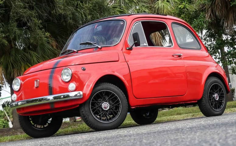 Open the bonnet and reveal a very clean and show ready 500 CC 2-cylinder engine, which when paired with a 4-speed manual is an absolute blast to drive! Think of it as an adult go cart! The 500L received radial tires instead of bias ply, and those radials are wrapping very cool black alloy wheels that give this car a bit of modern flair.