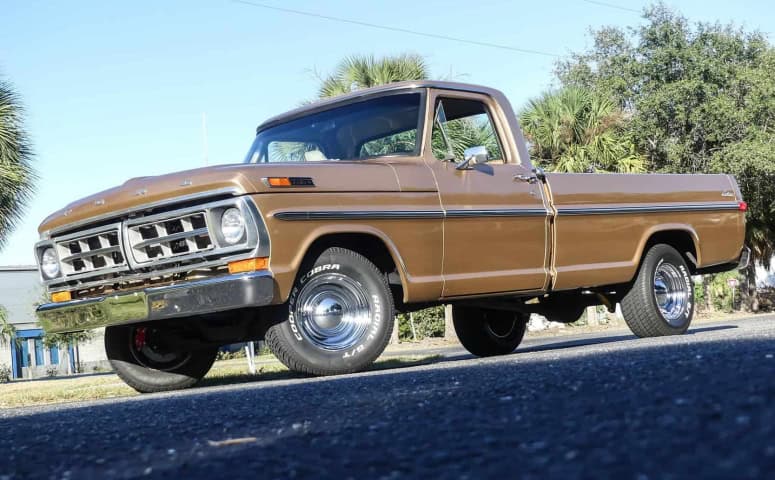 You will have a hard time finding a cleaner bumpside pickup truck! This 1971 Ford F100 is simply incredible! The fresh Light Ginger Poly paint job really fits this truck and pairs nicely with the color matched Line-X spray in bedliner and chrome dog dish wheels.