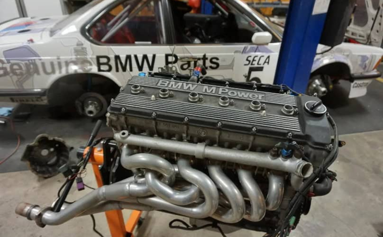This S38B35 inline-six and Getrag 265 5-speed manual gearbox were removed from a 1985 BMW M635CSi race car acquired in 2017. The gearbox is a Metric Mechanic-built “Ultimate” Getrag 265, and the engine was reportedly built in the early 1990s by Ken Adair of The Power Plant. It was rebuilt in 2008 and 2012, after which the previous owner is said to have retired from racing. Modifications include an increased displacement of 4.0L, Schrick 272 camshafts, European-spec exhaust headers, and more.