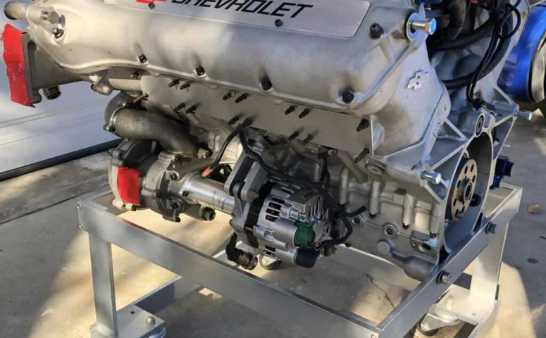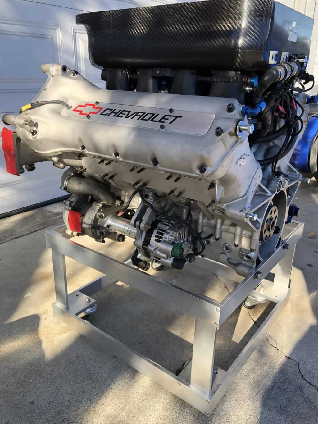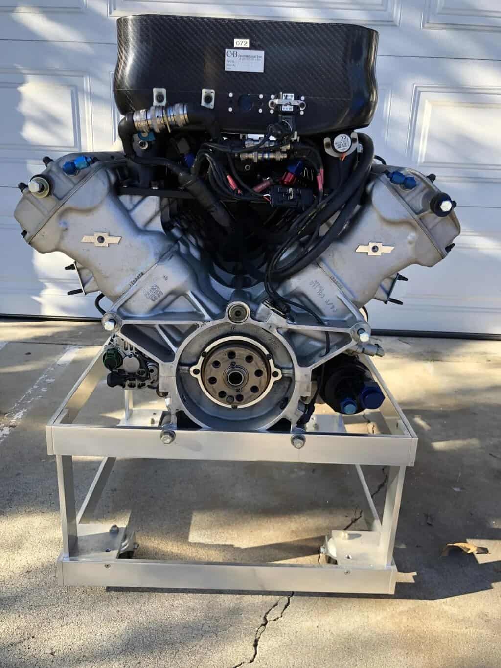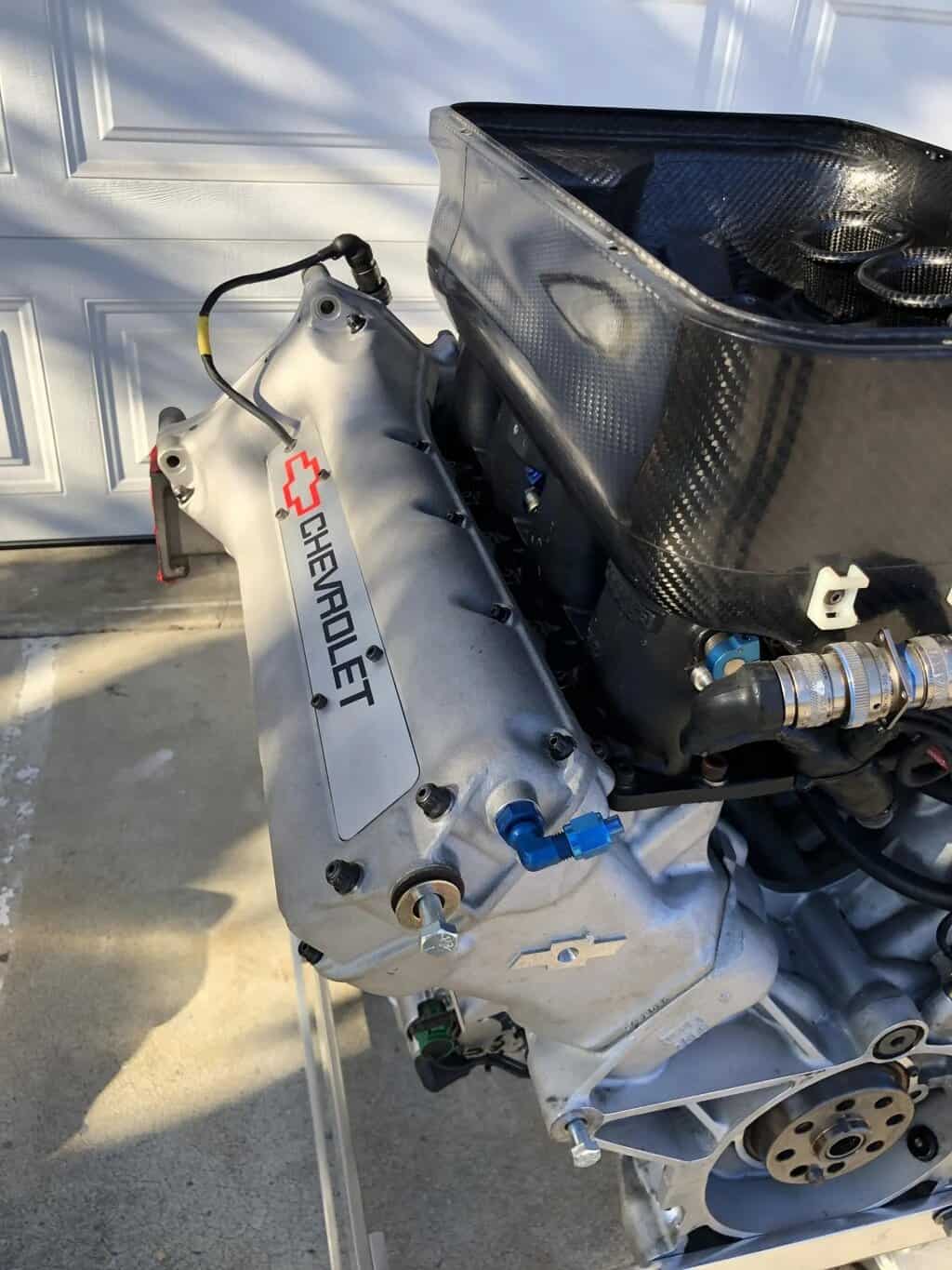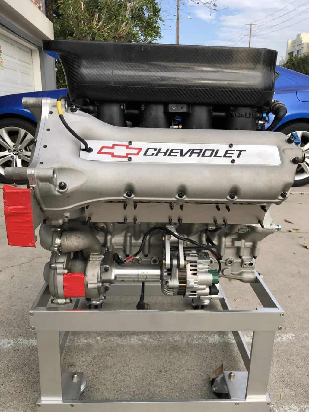 This 3.5-liter V8 is said to have been produced by Chevrolet for use in a 2002 Indy Racing League race car. The methanol-fueled engine features aluminum construction, double-overhead camshafts on each bank, dry-sump lubrication, Chevrolet-logo camshaft covers, exhaust headers, and a wiring harness.