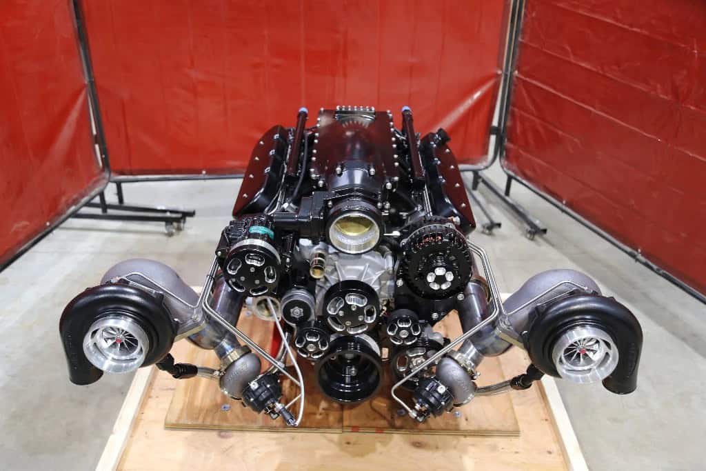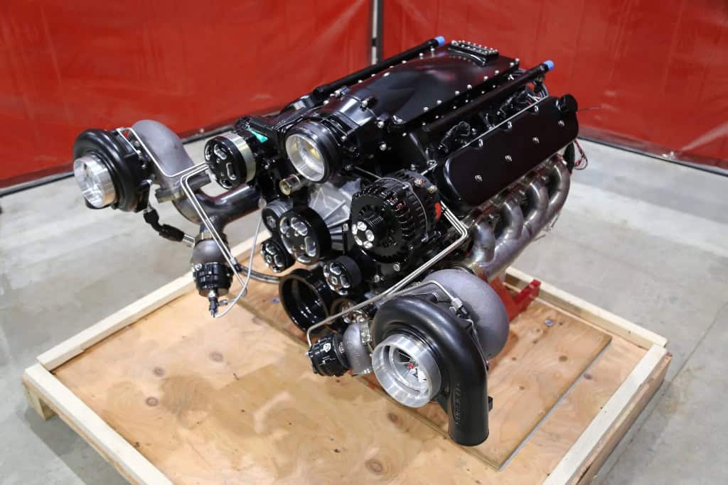 This 427ci V8 crate engine was built by Nelson Racing Engines of Chatsworth, California, and it features dual 72mm turbochargers and is rated by the manufacturer to produce up to 1,650 horsepower on racing fuel or 1,225 horsepower on pump gasoline. The Dart iron block is equipped with a Dart billet crankshaft, BoostLine forged connecting rods, JE Pistons, a custom hydraulic roller camshaft, a COMP Cams rocker-arm system, a Cloyes timing chain, LS3 cylinder heads, 1,200cc fuel injectors, Holley fuel management, an air-conditioning compressor, a power-steering pump, and various pulleys and brackets.